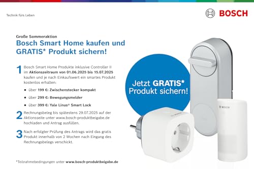- Maximaler Mehrwert im System: Zur Integration in das Bosch Smart Home System ist ein Bosch Smart Home Controller oder Bosch Smart Home Controller II erforderlich