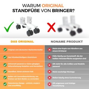 - LIEFERUMFANG: 2x universelle Standfüße für Infrarotheizung (Farbe: schwarz), 4x Rollen, 2x Schraube, 1x Schlüssel; Material: Standfüße aus Aluminium, Rollen aus Kunststoff