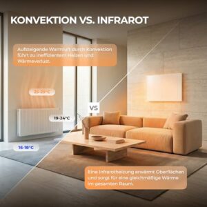 - Eine Infrarot Heizung ist deutlich effizienter und umweltfreundlicher als ein normaler Heizkörper. Unsere Elektroheizung verfügt über einen Überhitzungsschutz und ist für jeden Raum geeignet. Planen Sie bitte bei der Leistung mit 100-120 Watt/qm