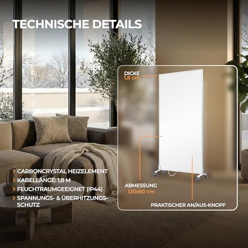 - Diese Infrarotheizung mit CarbonCrystal Heizelement sorgt für eine schnelle & gleichmäßige Wärmeverteilung im ganzen Raum, anders als herkömmlichen Heizungen. Gut für Asthmatiker und Rheumapatienten geeignet, da keine Staubwirbelung. Praktischer An/Aus-Schalter am Rahmen.