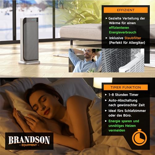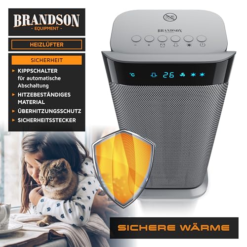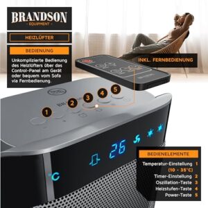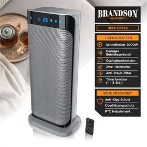 - Verwendung: Der elegante 2000W Brandson Keramik-Heizlüfter vereint eine hohe Heizleistung mit einem ansprechenden Design und hochwertigen Keramikelementen. Mit dem Schnell-Heizlüfter von Brandson können Sie schnell, sicher und energieeffizient bei geringem Stromverbrauch heizen. Dieses Gerät entfaltet seine volle Wirkung nur in gut isolierten Räumen.