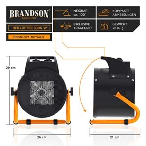 - ABMESSUNGEN (Länge x Breite x Höhe): 26,5 x 21 x 29 cm | Kabellänge: 135 cm (Aufbau: 4 x 1,5 mm²) | GEWICHT: 2,62 kg | Schallpegel: 55 db(A) |Farbe: schwarz, Gestell orange | LIEFERUMFANG: Brandson 3000 Watt Baustellen Heizlüfter + Bedienungsanleitung.