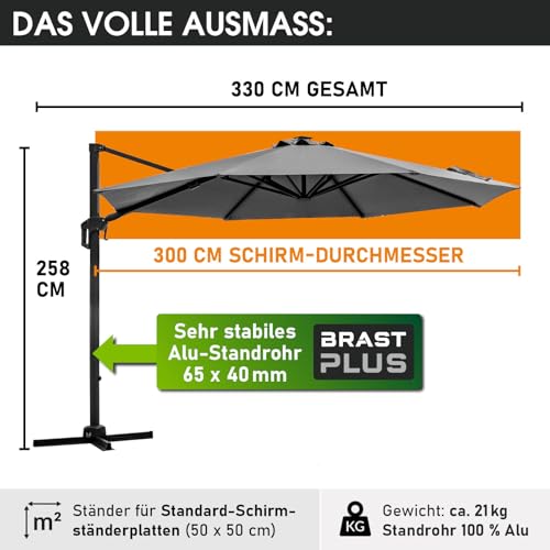 - 𝐓Ü𝐕-𝐠𝐞𝐩𝐫ü𝐟𝐭𝐞 𝐐𝐮𝐚𝐥𝐢𝐭ä𝐭: Der BRAST Ampelschirm 3m besticht durch sein robustes Standrohr aus 100% Aluminium, welches nicht nur witterungsbeständig, sondern auch rostfrei ist. Das Schirmgestänge aus galvanisiertem Stahl verstärkt die Robustheit zusätzlich. Unser großer Ampelschirm wurde vom TÜV auf sorgfältig geprüft und mit dem Siegel „Geprüfte Sicherheit“ ausgezeichnet
