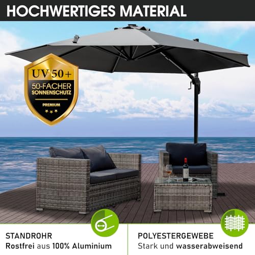 - 𝐄𝐱𝐭𝐫𝐚 𝐠𝐫𝐨ß𝐞𝐫 𝐒𝐨𝐧𝐧𝐞𝐧𝐬𝐜𝐡𝐮𝐭𝐳: Unser Ampelschirm beeindruckt mit 300cm Durchmesser (mit Ständer 330cm), einer wasserabweisenden Beschichtung aus 200g/m²-Gewebe und einem UV-Schutz 50+. Durch das edle Design, in elegantem Beige oder Grau, wird der Pendelschirm zum stilvollen Highlight in jedem Garten