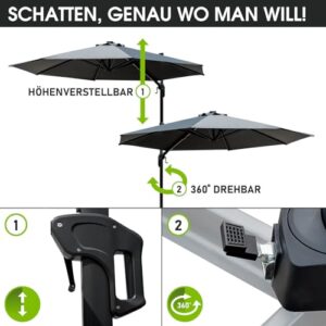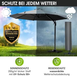 - 𝐁𝐞𝐬𝐨𝐧𝐝𝐞𝐫𝐬 𝐬𝐢𝐜𝐡𝐞𝐫: Im Lieferumfang enthalten sind eine wasserdichte Wetterschutzhaube, die Ihren Sonnenschirm optimal schützen. Das besonders stabile und robuste Gestänge garantiert in Kombination mit dem Eigengewicht des Ampelschirms einen sicheren Stand, sodass Sie unbesorgt und entspannt den Schatten genießen können