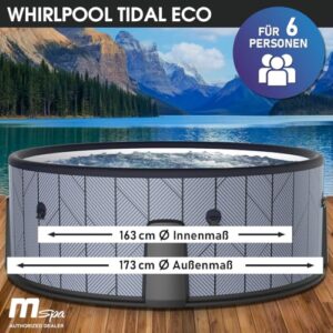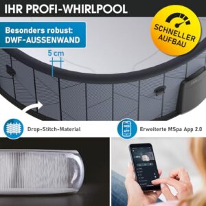 - 𝐄𝐢𝐧𝐟𝐚𝐜𝐡, 𝐬𝐜𝐡𝐧𝐞𝐥𝐥 & 𝐬𝐢𝐜𝐡𝐞𝐫: Unser Whirlpool TIDAL 6 Personen zeichnet sich durch die 5cm dicke DWF-Hochdruck-Drop-Stitch-Konstruktion mit extra dicker 6-Schicht-Materialtechnologie aus. Dabei ist der runde Whirlpool erheblich robuster & dennoch schmaler als herkömmliche aufblasbare Whirlpools. Die externe Kontrollbox mit Display oder die erweiterte MSpa App 2.0 ermöglichen eine einfache Steuerung, inkl. Energiespar-Timer. Der Anti-Rutsch-Boden bietet ein sicheres Ein- und Aussteigen
