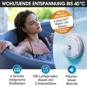- 𝐖𝐨𝐡𝐥𝐭𝐮𝐞𝐧𝐝𝐞 𝐄𝐧𝐭𝐬𝐩𝐚𝐧𝐧𝐮𝐧𝐠: Gönnen Sie sich zuhause ein Spa-Erlebnis der Extraklasse! Einer der leisesten Whirlpools weltweit mit 138 in 3 Intensitäten regelbaren Luftsprudel-Düsen für eine belebende Blasenmassage. Weltneuheit: die SyncJet Water-Jet-Düsen – kompakt, aber kraftvoll – sorgen für sanfte Hydromassage wie im Spa. Keine Installation nötig: einfach aufblasen, einschalten und genießen. Die Wassertemperatur lässt sich präzise bis zu 40 °C einstellen