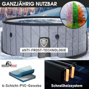 - 𝐆𝐚𝐧𝐳𝐣ä𝐡𝐫𝐢𝐠𝐞𝐫 𝐄𝐢𝐧𝐬𝐚𝐭𝐳: Unser Outdoor Whirlpool ist aus speziellem Rhino-Tech Gewebe gefertigt, das UV- und frostbeständig sowie reiß- und wetterfest ist. Dank Anti-Frost Technologie ist unser Whirlpool winterfest und ermöglicht eine ganzjährige Nutzung, da die Heizung bei Wassertemperaturen unter 1°C automatisch auf 3°C aufheizt. Die PTC-Keramik-Technologie mit Korrosionsschutzbeschichtung garantiert schnelles Aufheizen und spart Energiekosten