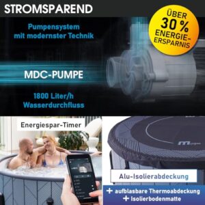 - 𝐒𝐭𝐫𝐨𝐦𝐬𝐩𝐚𝐫𝐞𝐧𝐝: Der Whirlpool verfügt über modernste Technologien, die zur Minimierung der Energiekosten beitragen. Die MDC-Pumpe bietet mit 1800l/Std 36% mehr Wasserdurchfluss bei 30% weniger Energieverbrauch. Die alu-isolierte Abdeckung mit integrierter aufblasbarer Thermoabdeckung und die Schaumstoff-Bodenmatte helfen die Wärme im Pool zu halten & reduzieren dadurch Heizkosten. Mit dem Energiespar-Timer lässt sich das Aufheizen des Pools flexibel zwischen 1-99 Stunden vorprogrammieren