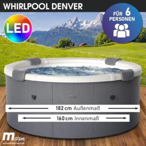 - 𝐈𝐡𝐫 𝐏𝐫𝐨𝐟𝐢 𝐖𝐡𝐢𝐫𝐥𝐩𝐨𝐨𝐥 𝐟ü𝐫 𝐙𝐮𝐡𝐚𝐮𝐬𝐞: Schaffen Sie Wellnessmomente mit dem Außenwhirlpool DENVER für bis zu 6 Personen. Der runde Whirlpool verspricht ein exklusives Spa-Erlebnis zum kleinen Preis. Das neue WPC-Modulsystem mit cleveren Zapfenverbindungen & leichten Seitenteilen ermöglicht einen schnellen, stabilen Aufbau in 15 Minuten. Das abgerundete Design sorgt für gleichmäßige Druckverteilung & hohe Langlebigkeit. Die Steuerung erfolgt über das OLED-Display oder die erweiterte MSpa App 2.0