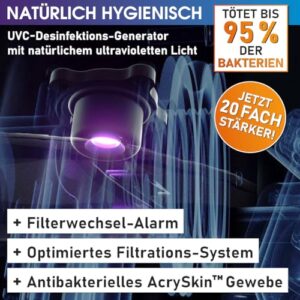 - 𝐍𝐚𝐭ü𝐫𝐥𝐢𝐜𝐡 𝐡𝐲𝐠𝐢𝐞𝐧𝐢𝐬𝐜𝐡 𝐝𝐚𝐧𝐤 𝐦𝐨𝐝𝐞𝐫𝐧𝐬𝐭𝐞𝐫 𝐓𝐞𝐜𝐡𝐧𝐢𝐤: Die verbesserte UVC-PLUS-Desinfektion eliminiert 95% der Bakterien – jetzt 20-fach stärker. Das antibakterielle Innengewebe mit AcrySkin Beschichtung hemmt 99% der Bakterienvermehrung. Das optimierte Filtersystem verfügt über eine automatische System-Reinigung gegen Ablagerungen und Blockaden, einen energiesparenden Durchfluss, eine automatische Filtration & einen Filter-Wechsel-Alarm. Dispenser für Reinigungstabletten und pH-Teststreifen inklusive