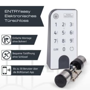 - LIEFERUMFANG & MONTAGE: 1× BURG-WÄCHTER elektronisches Türschloss secuENTRYeasy 7601 PIN bestehend aus Zylinder und PIN-Keypad, 1× BURG-WÄCHTER RFID-Transponder ENTRY 7710 inkl. Batterien und Montagezubehör. Die Montage erfolgt ohne Bohren.
