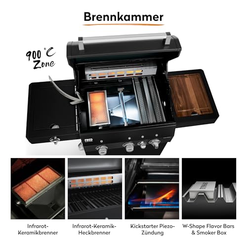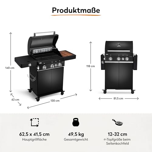 - MAXIMALE BBQ POWER - Infrarot-Heckbrenner, innenliegender 900°C Keramikbrenner, 2 stufenlos regulierbare Edelstahl-Stabbrenner & Seitenkochfeld