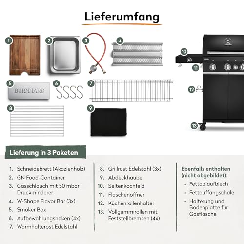 - ALLROUND-GASGRILL MIT TOP-AUSTATTUNG - Klappbare Seitentische mit integriertem Drehregler, GN-Food Container mit FSC-zertifizierten Akazienholz Schneidebrett, Deckelthermometer, Küchenrollenhalter, magnetischer Flaschenöffner, Smoker Box & mehr!