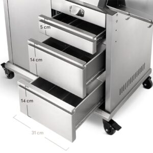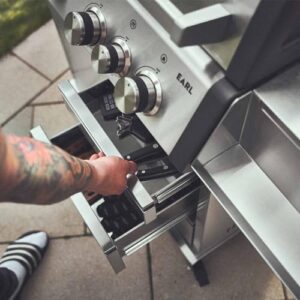 - VOLLE LEISTUNG: Unser Gasgrill mit Heckbrenner kommt mit geräumigem Unterschrank aus Edelstahl und bietet genug Platz für deine 11 kg-Gasflasche. 3 Schubladen, Vollgummirollen und abklappbare Seitentische machen EARL zur flexiblen BBQ-Station.