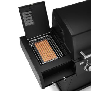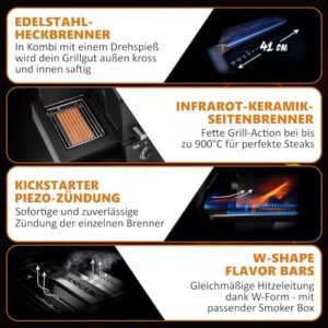 - UNSCHLAGBAR HEISS: Mit dem zusätzlichen Infrarot-Keramikbrenner im abklappbaren Seitentisch des Edelstahl-Grills bekommen Steaks und Co. dank extremer Hitze eine besonders krosse Kruste.
