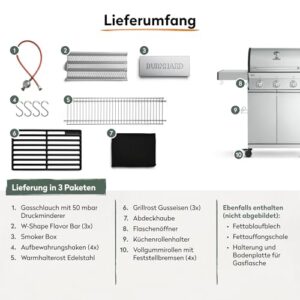 - HOCHWERTIGE ABDECKHAUBE INKLUSIVE - Wetterfeste & UV-beständige Grillabdeckung, wird zusammen mit dem Grill in 3 separaten Paketen geliefert