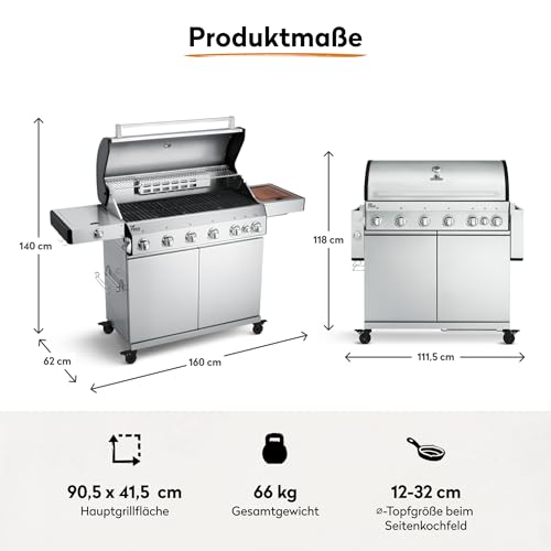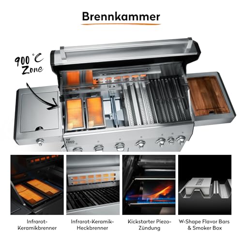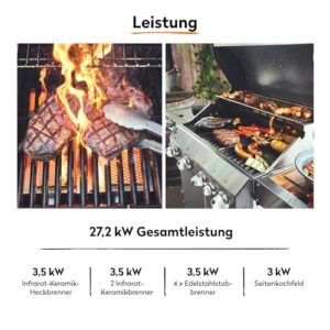 - MAXIMALE BBQ POWER - Infrarot-Heckbrenner, 2 innenliegende 900°C Keramikbrenner, 3 stufenlos regulierbare Edelstahl-Stabbrenner & Seitenkochfeld