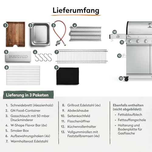 - ALLROUND-GASGRILL MIT TOP-AUSTATTUNG - Klappbare Seitentische mit integriertem Drehregler, GN-Food Container mit FSC-zertifizierten Akazienholz Schneidebrett, Deckelthermometer, Küchenrollenhalter, magnetischer Flaschenöffner, Smoker Box & mehr!