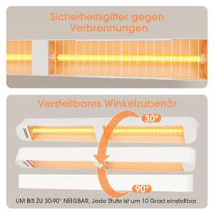- 【Optionale Montagemöglichkeiten】Ausgestattet mit verstellbaren Montagehalterungen zur Decken- oder Wandmontage. Der Neigungswinkel ist zwischen 30° und 90° einstellbar, mit 10°-Rasterung pro Stufe, sodass Sie die Infrarotheizung flexibel und präzise auf den gewünschten Bereich ausrichten können.