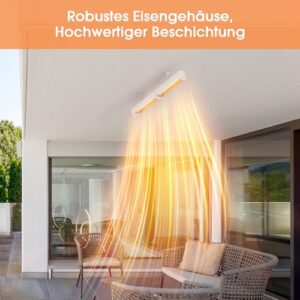 - 【Geeignet für den Innen- und Außenbereich】Die Infrarotheizung sorgt sowohl in geschlossenen Räumen als auch in offenen oder halb offenen Außenbereichen für eine angenehme und gleichmäßige Wärme, Ideal geeignet für den Einsatz in Wohnzimmern, Pavillons, Terrassen, Balkonen, Garagen, Werkstätten sowie in Outdoor-Cafés und Restaurants.