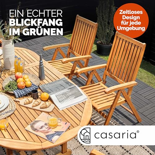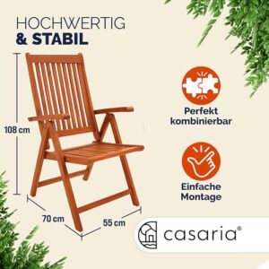 - HOCHWERTIG - Genieße entspannte Stunden mit den stilvollen CASARIA Gartenstühlen Vanamo. Der klappbare Hochlehner aus FSC-zertifiziertem Eukalyptusholz überzeugt durch seine elegante Holzmaserung und fügt sich perfekt in deinen Garten, auf die Terrasse oder den Balkon ein.