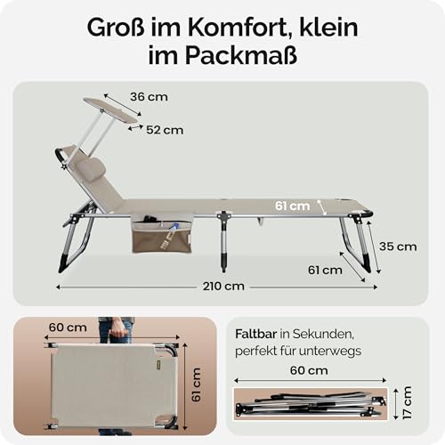 - KLAPPBAR - Nutze die faltbare und leichte Aluminium Gartenliege als Reisebegleiter. Die 2 Transportschlaufen ermöglichen einfaches Tragen. So kannst du deine Relaxliege bequem an den Strand oder See mitnehmen und im Auto verstauen.