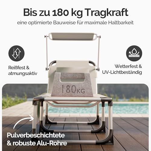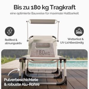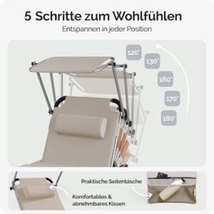 - VERSTELLBAR - Die 5-fach einstellbare Rückenlehne des Liegestuhles ermöglicht dir eine angepasste Liegeposition. Das Sonnendach ist individuell anpassbar, sodass du immer ausreichend Schatten im Gesicht hast. Das Dach kann bei Bedarf abgenommen werden