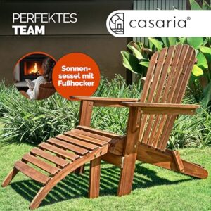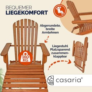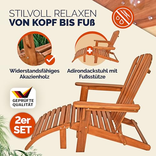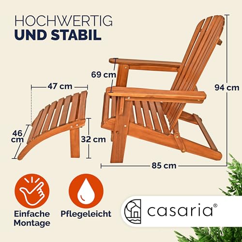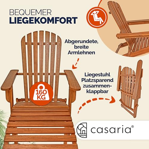 - SONNE GENIEßEN: Genieße die schönen sonnigen Tage auf dem eleganten Adirondack Liegestuhl inklusive Fußstütze von CASARIA. Der Gartenstuhl, aus massivem Akazienholz gefertigt, ist dank seines komfortablen, abgerundeten Designs besonders bequem und lädt dich zum Relaxen in deinem Garten ein.