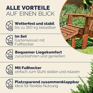 - STABILITÄT: Der bequeme, wetterfeste und sehr robuste Relaxsessel, wie auch die praktische Fußstütze, halten einer maximalen Belastung von ca. 160kg mühelos stand. Dein Waldsessel kommt Vorgeölt bei dir an und ist somit optimal für den direkt Einsatz im Außenbereich geeignet.