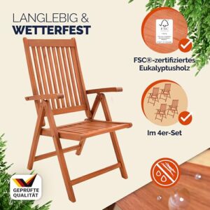 - ROBUSTES MATERIAL: Der stabile und wetterfeste Hochlehner ist aus FSC-zertifiziertem, wetterfestem Eukalyptusholz gefertigt, mit Pflegeöl-Finish vorbehandelt und optimal für eine dauerhafte Nutzung im Freien geignet. Der Holzstuhl hält hohen Belastungen bis 160kg bestens stand.