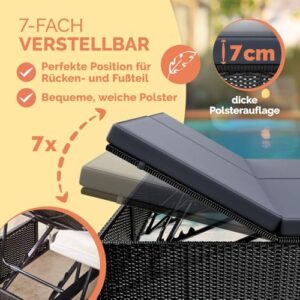 - WETTERFEST & FLEXIBEL - Das Polyrattan-Geflecht ist UV-beständig und schmutzabweisend. Die Auflagen sind zudem wasserabweisend, falls es mal zu einem kurzen Regenschauer kommt. Die Relaxliege eignet sich für den Außenbereich und ist in den Wintermonaten auch problemlos im Innenbereich einsetzbar.