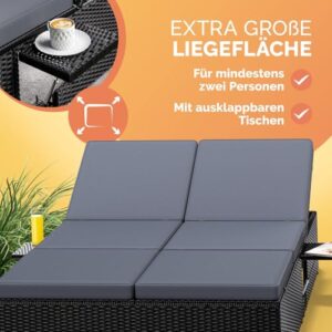 - PLATZ FÜR ZWEI - Die CASARIA Sonnenliege mit einer Liegefläche von 200x115cm bietet ausreichend Platz für zwei Personen. Der pulverbeschichtete Stahlrahmen der Gartenliege ist bis zu 400kg belastbar. Die 7cm hohe Auflage verbindet Komfort mit einem harmonischen Design, das in jeden Garten passt.