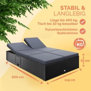 - PLATZ FÜR ZWEI - Die CASARIA Sonnenliege mit einer Liegefläche von 200x115cm bietet ausreichend Platz für zwei Personen. Der pulverbeschichtete Stahlrahmen der Gartenliege ist bis zu 400kg belastbar. Die 7cm hohe Auflage verbindet Komfort mit einem harmonischen Design, das in jeden Garten passt.