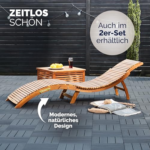 - PFLEGELEICHT - Das wetterfeste Akazienholz lässt sich mühelos mit einem feuchten Tuch reinigen. Um die schöne Holzfarbe zu erhalten, empfehlen wir eine gelegentliche Pflege mit speziellem Holzöl. So bleibt deine Liege über Jahre hinweg ein stilvolles Highlight in deinem Garten.