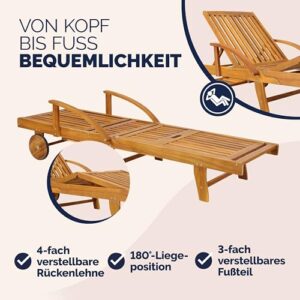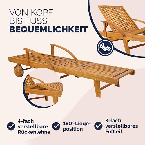 - WERTIGES HOLZ & EINFACHE PFLEGE: Akazie gehört mit zu den Massivholzarten und ist vor allem robust und wetterfest. Dabei wirkt es, durch seinen Farbton, sehr hochwertig und luxuriös. Tipp! Öle deine Holzliege am besten einmal im Jahr nach. So sorgst du für eine Langlebigkeit.