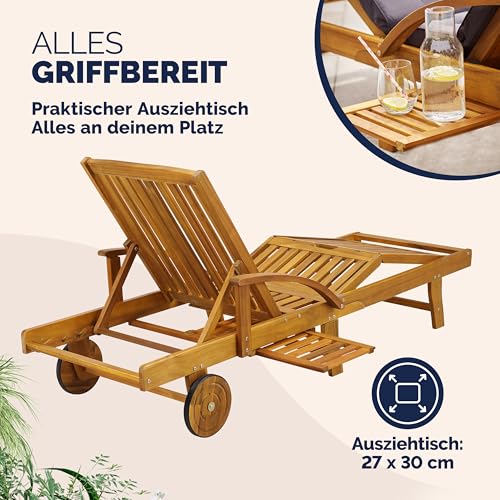 - AUSZIEHBARER TISCH: Damit du deine Getränke oder Snacks abstellen kannst, befindet sich an der Holzliege ein kleiner Beistelltisch, den du ausziehen kannst. So bist du besonders flexibel. Der Gartentisch hat die Maße 27x30 cm und besteht ebenfalls aus geölter Akazie.