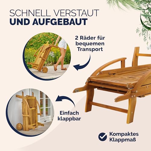 - LEICHTER TRANSPORT: Nicht nur die Klappfunktion sorgt für ein einfaches transportieren, sondern auch die 2 Räder aus Holz. So kannst du den Liegestuhl entspannt in deinem Garten bewegen. Darüber hinaus ist die Klappliege mit bis zu 160kg belastbar und sehr robust.