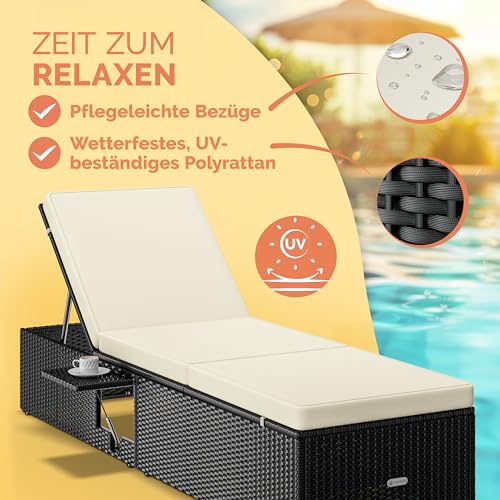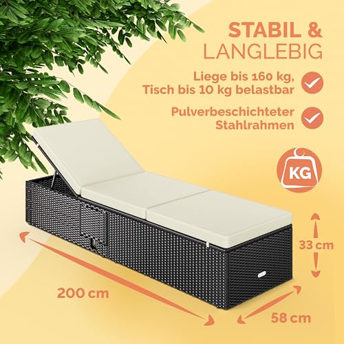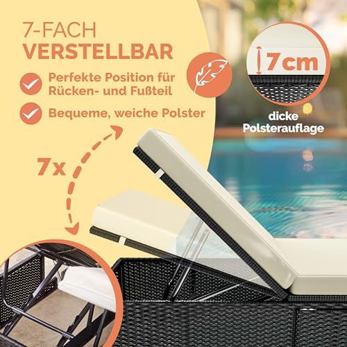 - KOMFORTABEL & ROBUST - Der Rahmen des Liegestuhls ist aus pulverbeschichtetem Stahl gefertigt und bietet dir eine Belastbarkeit von bis zu 160kg. Das hochwertige Polyrattan, kombiniert mit den 7cm hohen Auflagen, fügt sich mit einer harmonischen Farbkombination perfekt in jeden Garten ein.