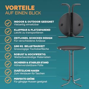 - KLAPPBAR & ELEGANT: Der Stehtisch von CASARIA ist faltbar und macht überall eine gute Figur - auf der Gartenparty, beim Sektempfang oder beim Familienfest. Dank der einklappbaren Tischplatte, mit einer Dicke von 1,8cm, kann der Cocktailtisch platzsparend verstaut werden, wenn er nicht gebraucht wird.