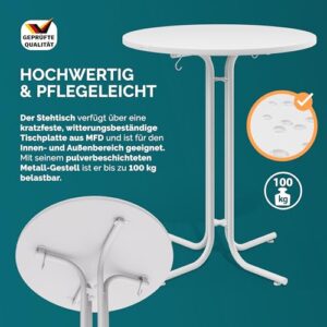 - KLAPPBAR & ELEGANT - Der Hochtisch ist faltbar und macht überall eine gute Figur - auf der Gartenparty, beim Sektempfang oder beim Familienfest. Dank der klappbaren Tischplatte, mit einer Dicke von 1,8cm, kann der Cocktailtisch platzsparend verstaut werden, wenn er nicht gebraucht wird.