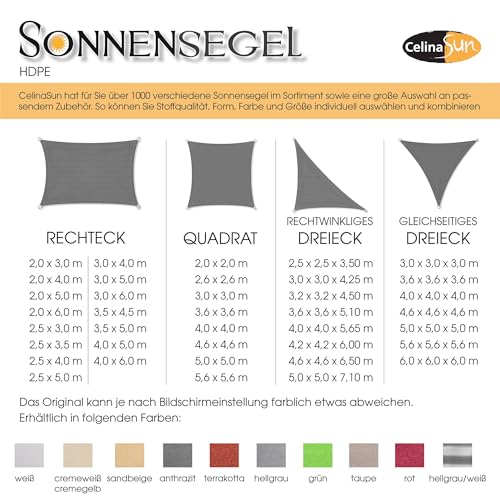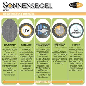 - CelinaSun Premium HDPE Sonnenschutz wasserdurchlässig und robust, klimaregulierender Netzstruktur, einfache und schnelle Montage. Zur Befestigung sind an den Ecken Edelstahlösen angebracht, diese wurden extra 5-fach quer vernäht um eine erstklassige Stabilität zu erzielen