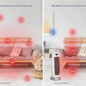 - Ventilator für hohe Kühlleistungen an warmen Tagen Dank eines Vertikallüfters mit dynamischem Luftstrom von 5 Metern/Sekunde erzeugt der Heizlüfter CA-904C eine leichte oder eine starke kühlende Brise. 2in1: Bei ausgeschalteter Heizfunktion erzeugt der CA-904C als Ventilator eine angenehm kühlende Brise im Sommer.