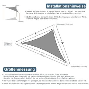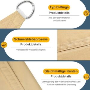 - 〖Einfach zu installieren〗: Das Sonnensegel kann schnell an Bäumen, Wänden und hohen Stangen aufgehängt werden. Jede Ecke hat einen D-Ring aus Edelstahl 316 mit Seil. Wir empfehlen, das Segel mit 20-40 Grad zu spannen, stellen Sie sicher, dass das Regenwasser abfließt und vermeiden Sie die Bildung von Wasserfällen