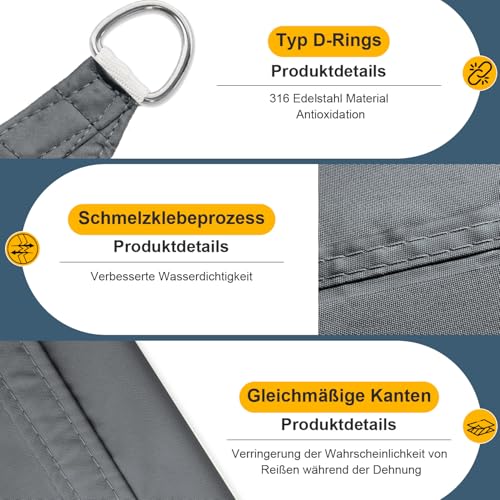- 〖Wasserdicht〗: Die Oberfläche des Sonnensegels hat eine wasserdichte Beschichtung.Die Leinwand besteht aus 2 Stoffstücken und hat eine Naht. An den Nähten kommt Heißklebetechnik zum Einsatz,Kein Wassereinbruch.Nicht empfohlen bei starkem Wind, starkem Regen und anderen schlechten Wetterbedingungen.