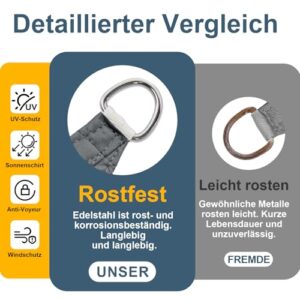 - 〖Einfach zu installieren〗: Das Sonnensegel kann schnell an Bäumen, Wänden und hohen Stangen aufgehängt werden. Jede Ecke hat einen D-Ring aus Edelstahl 316 mit Seil. Wir empfehlen, das Segel mit 20-40 Grad zu spannen, stellen Sie sicher, dass das Regenwasser abfließt und vermeiden Sie die Bildung von Wasserfällen