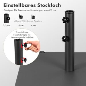 - 【Verstellbares Stangenloch und 2 Handfeststellknöpfe】Der Sonnenschirmständer verfügt über 2 Adaptergrößen, die für die meisten Terrassenschirme mit 41 mm/49 mm Durchmesser passen. Darüber hinaus ist er mit 2 Handspannknöpfen ausgestattet, um die Schirmstange an Ort und Stelle zu befestigen und so optimale Festigkeit und Stabilität zu gewährleisten.