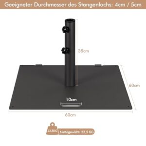 - 【Ausreichendes Gewicht und einfacher Aufbau】Dieser Schirmgewicht misst 60 x 60 x 35 cm (L x B x H) und bietet eine große Auflagefläche für zusätzliche Stabilität. Mit einem Gewicht von 21,5 kg bietet er starken Halt, ohne dass Sie sich Sorgen machen müssen, dass ihr Schirm herunterfällt. Mithilfe der Anleitung lässt sich dieser Schirmständer schnell aufbauen.