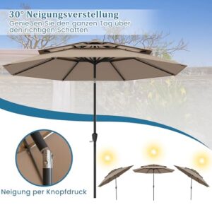 - 【Solarbetriebene LED-Lichter】Der Solar-Marktschirm im Freien ist mit 32 hellen LED-Lichtern entlang der Streben ausgestattet, die von einem energiesparenden Solarpanel betrieben werden und nach einer vollständigen Aufladung 6-8 Stunden lang leuchten können, was das romantische Ambiente Ihres Gartens in der Nacht verstärkt.