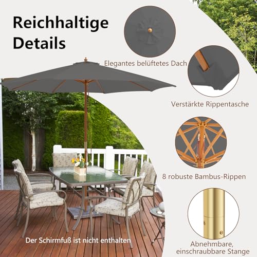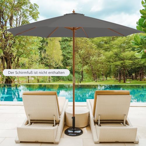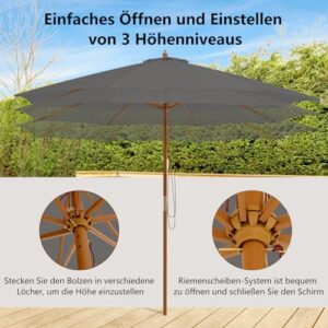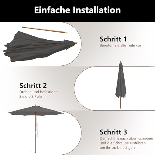 - 【Stabile Holzkonstruktion】Die 8 starken Schirmrippen aus Bambus brechen nicht so schnell und werden durch die starken Rippentaschen an Ort und Stelle gehalten, sodass sie dem Schirmdach starken Halt bieten können. Des Weiteren gewährleistet die dicke Holzstange eine gute Stabilität im Freien und bietet Platz für Schirmständer mit einem Lochdurchmesser von 38mm (nicht im Lieferumfang enthalten).